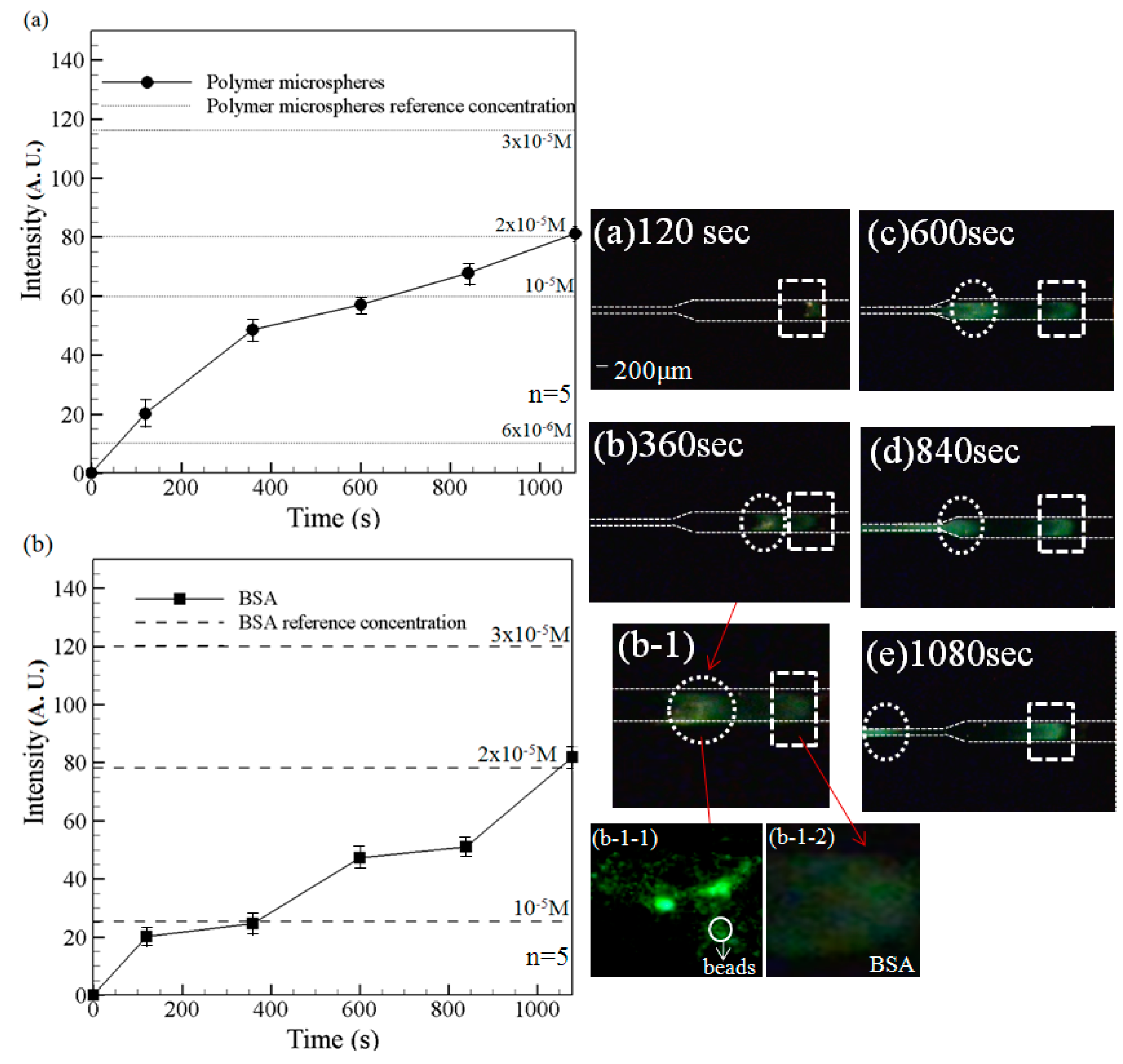 Figure 7b-1 (4× objective lens)) clearly show both a plug of BSA solution (white dotted rectangular region) and a concentrated region of fluorescent particles (white dotted circular frame). As shown in