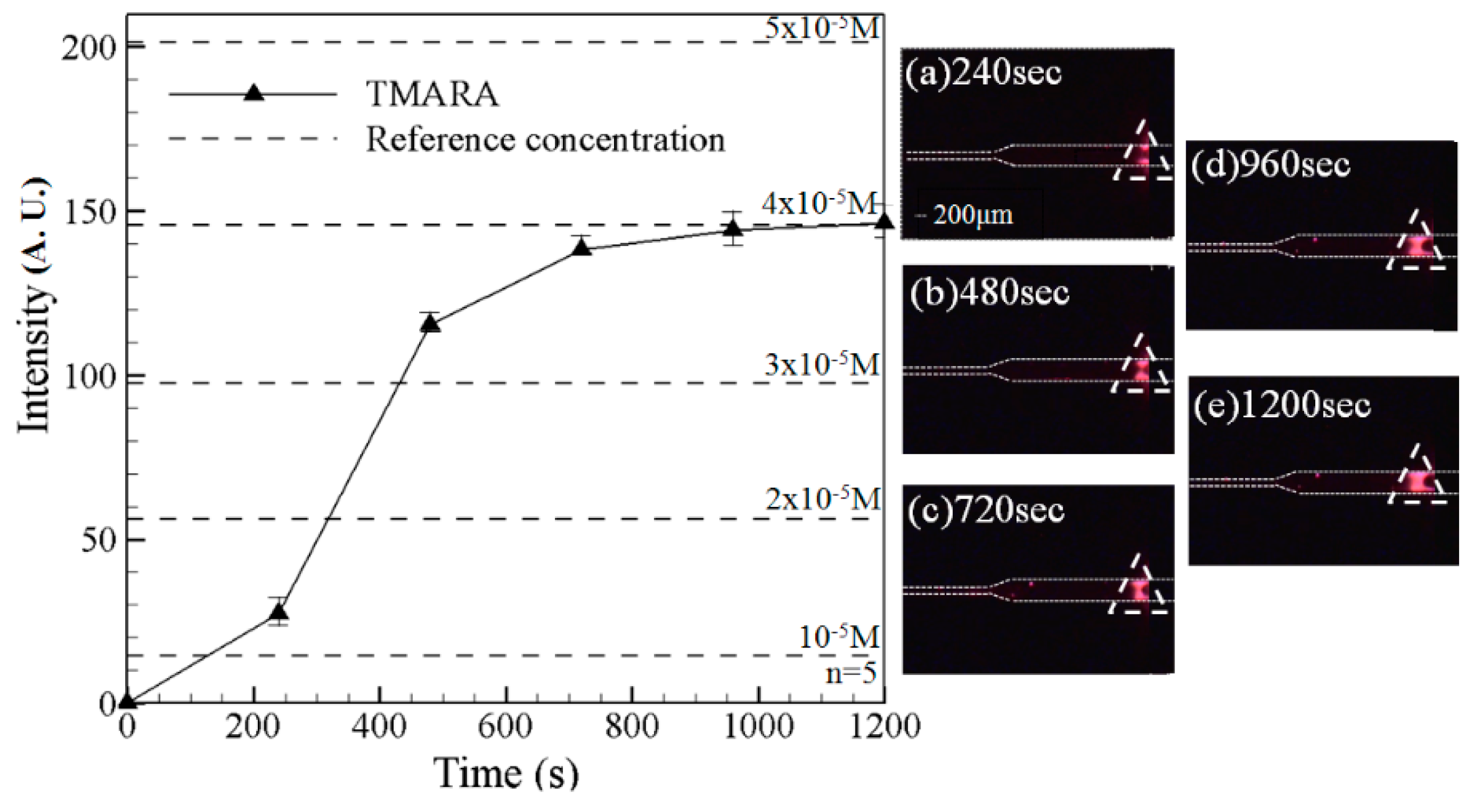 Figure 8 shows the variation over time of the fluorescence intensity signal corresponding to the TAMRA component of the mixed sample. Note that the experimental images were captured using the filter lens with a receiving wavelength range of 510~590 nm. Hence, the fluorescence intensity signals of the BSA (450~490 nm) and polymer beads (450~490 nm) are not observed.