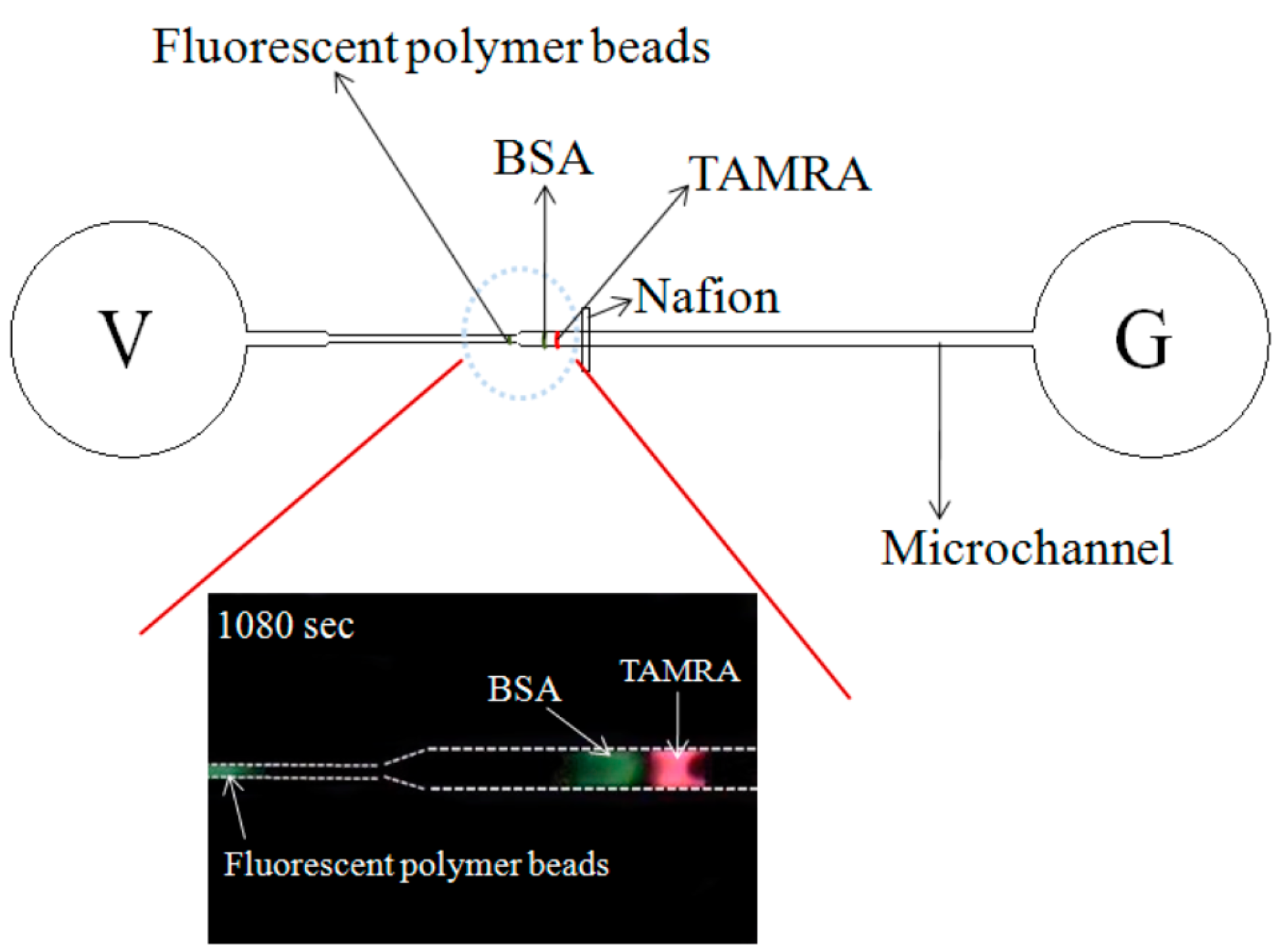 Figure 9 illustrated the superimposed image showing the BSA/beads and TAMRA, respectively, at the final observation time of 1080 s. It clearly shows the mixed species are both concentrated and separated.