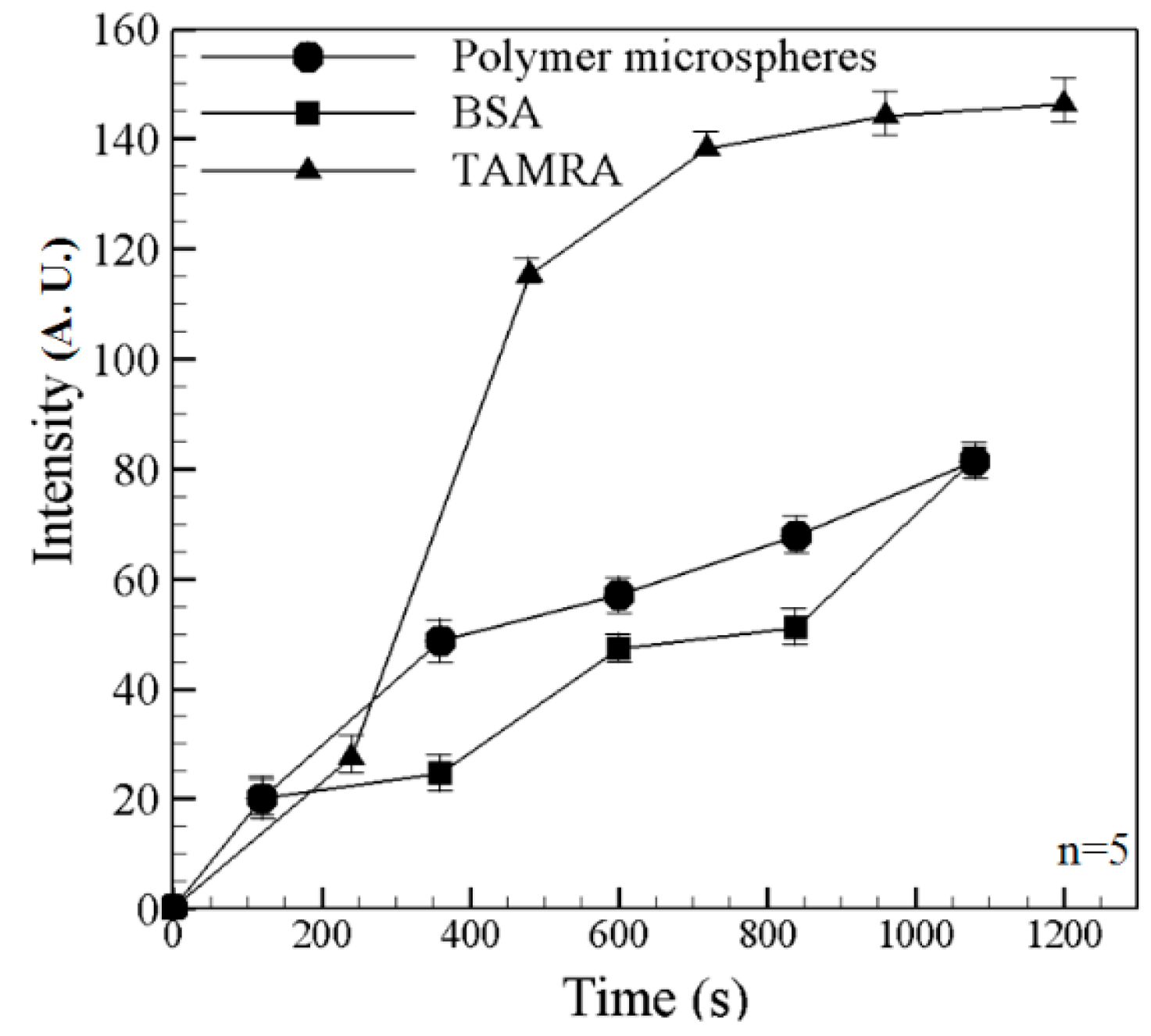 Fluorescence intensity curves of polymer microspheres, BSA and TAMRA at each time point. Data points represent the mean of five measurements, and the error bars represent one standard deviation from the mean.