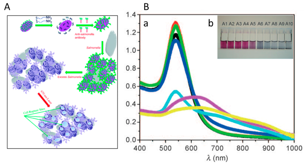 (A) Schematic of a colorimetric AuNPs based approach to selectively target and destroy pathogenic bacteria with antibody-conjugated oval-shaped AuNPs; (B-a) Absorption-profile of anti-salmonella-antibody-conjugated oval-shaped AuNPs in the absence of bacteria (red) due to the addition of 106 CFU/mL E. coli bacteria (green) or different concentrations of Salmonella bacteria (10 (black), 50 (dark blue), 103 (light blue), 104 (pink), and 105 bacteria (yellow)). The new band at around 680 nm following the addition of Salmonella, indicates the aggregation of the AuNPs (B-b) Photograph shows colorimetric change upon the addition of (A1) 10, (A2) 50, (A3) 100, (A4) 500, (A5) 1000, (A6) 5000, (A7) 10,000, (A8) 50,000, (A9) 100,000, and (A10) 500,000 Salmonella (reprinted with permission from []).