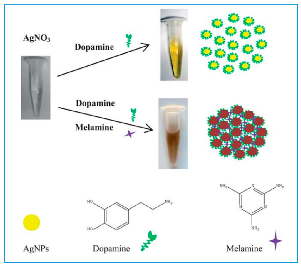 Schematic illustration of colorimetric method with AgNPs/dopamine system for the detection of melamine (reproduced from [] with permission of The Royal Society of Chemistry).