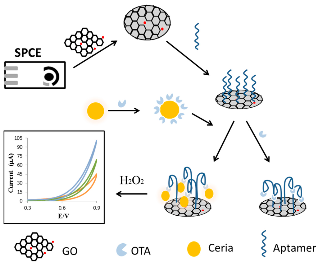Non-enzymatic electrochemical aptasensor based on the use of a nanoceria tag and graphene oxide (GO) on a screen-printed electrode (SPCE) for the detection of ochratoxin A (OTA) (reproduced from [] with permission of The Royal Society of Chemistry).