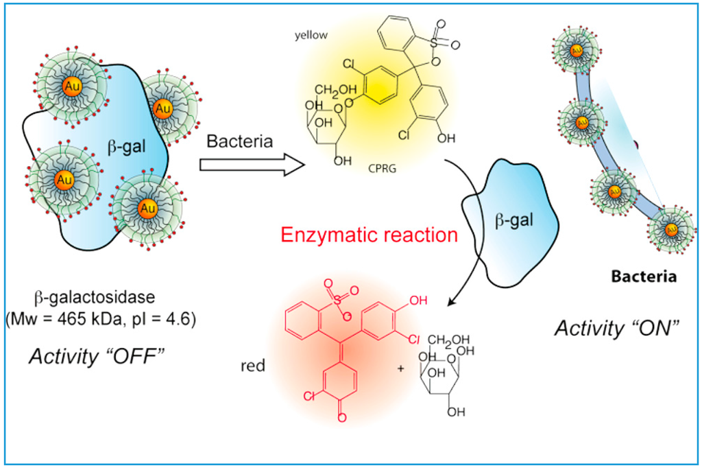 E. coli O157:H7 [], which can contaminate ground beef, raw milk, poultry products, cold sandwiches, vegetables, and drinking water supplies [,,], is recognized as one of the most dangerous pathogens. Most methods designed for on-site detection of E. coli involve competitive displacement assays [] or immuno-chromatographic test strips []. Miranda et al. developed a hybrid colorimetric enzymatic nanocomposite biosensor for the detection of E. coli in aqueous solutions based on enzyme amplification. The efficiency of the method was demonstrated in both solution and test strip format []. In this design, cationic AuNPs featuring quaternary amine head groups are electrostatically bound to an anionic enzyme, β-galactosidase, leading to inhibition of the enzyme activity. Upon binding of bacteria to the AuNPs, β-galactosidase is released restoring its activity. The binding event was quantified by colorimetric means. Using this strategy, bacteria at concentrations of 1 × 102 bacteria/mL in solution and 1 × 104 bacteria/mL in a field-friendly test strip format have been quantified (Figure 5) [].