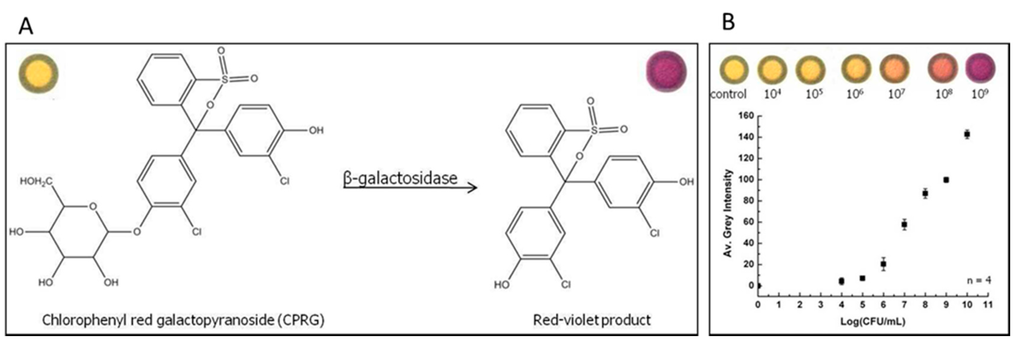 (A) Schematic shows the enzymatic reaction between galactosidase and chlorophenyl red galactopyranoside; (B) Calibration curve for detection of E. coli has been drawn for determination of the limit of detection for live bacterial assay (reprinted with permission from []; copyright 2015 American Chemical Society).