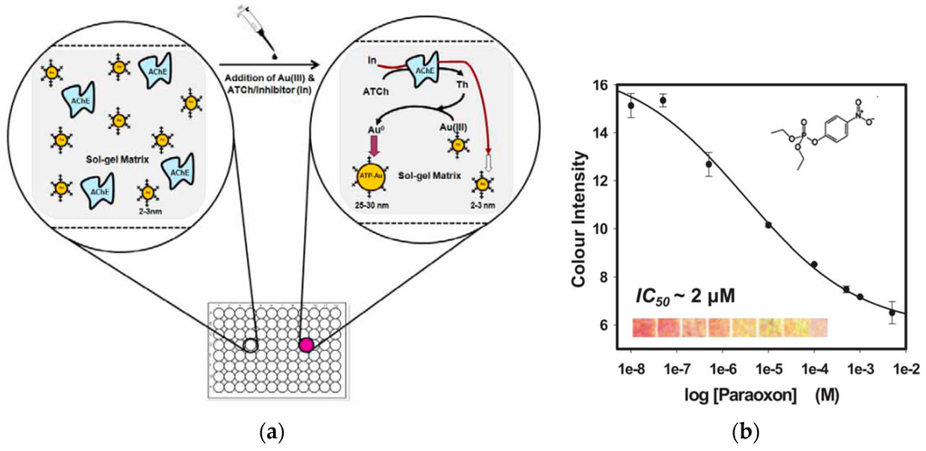 - Luckham, R.E.; Brennan, J.D. Bioactive paper dipstick sensors for acetylcholinesterase inhibitors based on sol-gel/enzyme/gold nanoparticle composites. Analyst 2010, 135, 2028–2035. [Google Scholar] [CrossRef] [PubMed]
