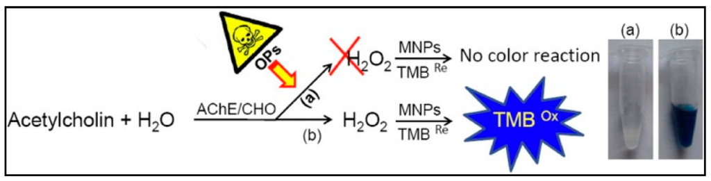 Liang et al. reported a colorimetric method using a bi-enzyme system, AChE and choline oxidase (ChO), and Fe3O4 MNPs with peroxidase mimetic activity to detect of OPs and nerve agents []. ChO catalyzed the conversion of the product of the AChE reaction, choline to hydrogen peroxide (H2O2). The produced H2O2 was then detected colorimetrically by a color change generated by the catalytic action of the MNPs on the oxidation of 3,5,3′,5′-tetramethylbenzidine (TMB). In the presence of pesticides, the enzymatic activity of AChE was inhibited and less H2O2 was produced. The decrease in the color intensity was used to quality AChE inhibition by pesticides (Figure 9).
