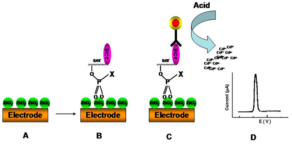Electrochemical immunosensing of phosphorylated AChE using a ZrO2 NP-modified SPE (A) with selective capturing of phosphorylated AChE adducts (B) and detection via (C) Immunoreaction between bound phosphorylated AChE adducts and QD-labeled anti-AChE antibody (D) Representative voltammogram (reprinted with permission from []).