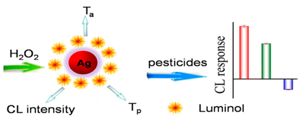 - He, Y.; Xu, B.; Li, W.; Yu, H. Silver nanoparticle-based chemiluminescent sensor array for pesticide discrimination. J. Agric. Food Chem. 2015, 63, 2930–2934. [Google Scholar] [CrossRef] [PubMed]