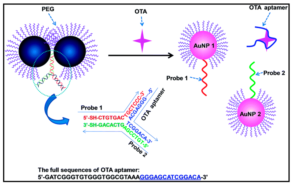 Toxin fungal metabolites known as mycotoxins can contaminate a wide range of agricultural commodities and are high priority targets for the development of new bioassays. It is estimated that at least 25% of the grain produced worldwide is contaminated with mycotoxins. Even small concentrations of mycotoxins can induce significant health problems including vomiting, kidney disease, liver disease, cancer and death []. Aflatoxins, ochratoxins, trichothecenes, zearalenone, fumonisins, tremorgenic toxins, and ergot alkaloids are examples of toxic mycotoxins. Mycotoxins have been implicated in development of cancer by the WHO-International Agency for Research on Cancer in 1993. Naturally occurring aflatoxins are classified as carcinogenic to humans (Group 1) whereas ochratoxins and fumonisins are classified as possible carcinogens (Group 2B) []. Aflatoxins are the most studied group of mycotoxins []. Another important toxin, ochratoxin A (OTA) is a type of mycotoxin which is produced by several species of Aspergillus and Penicillium fungi and can be found in a wide variety of food matrices such as cereals, dried fruits, coffee, cocoa, spices, beer, wine and grape juice []. Hosseini et al. developed a AuNP-based aptasensor for detection of aflatoxin B1. The sensor measured AuNP aggregation due to desorption of the aflatoxin B1 aptamer from the surface of AuNPs after the aptamer-target interaction resulting in the color change of AuNPs from red to purple. A detection limit of 7 nM with a linear range from 80 to 270 nM was reported []. A similar approach was described by Luan et al. for the detection of aflatoxin B2 []. In the absence of aflatoxin B2, the random coil structure of the aptamer stabilizes the surface of AuNPs, which shows a red color under high NaCl conditions. In presence of aflatoxin B2, formation of aflatoxin B2-aptamer conjugate destabilizes the AuNPs from NaCl-induced aggregation, changing the color of the dispersion. The method was characterized by a linear dynamic range from 0.025 to 10 ng·mL−1, and a detection limit of 25 pg·mL−1. Xiao et al. demonstrated a colorimetric detection method based on disassembly of AuNP dimers for the detection of OTA (Figure 12). This system was characterized by a low detection of 0.05 nM, with a dynamic range from 0.2 to 250 nM []. The proposed sensor was applied for detection of OTA in red wine. The OTA concentration determined by this method was consistent with the result obtained with a commercially available ELISA kit. Soh et al. described a colorimetric method for detection of OTA by using aptamer controlled growth of AuNPs []. In this system the aptamer-target interactions control the amount of aptamer strands adsorbed on the surface of AuNPs. Depending on the surface coverage, AuNPs grow into morphologically varied nanostructures resulting in different colored solutions. AuNPs with low aptamer coverage produced red-colored solutions, whereas AuNPs with high aptamer coverage produced blue colored solutions. The detection limit for OTA using this method was 1 nM.