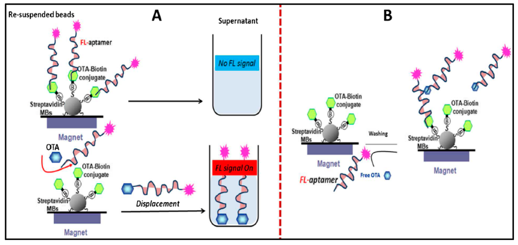 Schematic represents the principle of the assay for the fluorescence detection methodologies. (A) displacement assay; (B) competition assay. (With permission from Springer Science and Business Media: Analytical and Bioanalytical Chemistry. Development of an aptasensor based on a fluorescent particles-modified aptamer for ochratoxin A detection. 407, 2015, 7815–7822 Hayat, A.; Mishra, R.K.; Catanante, G.; Marty, J.L. Scheme 1.).