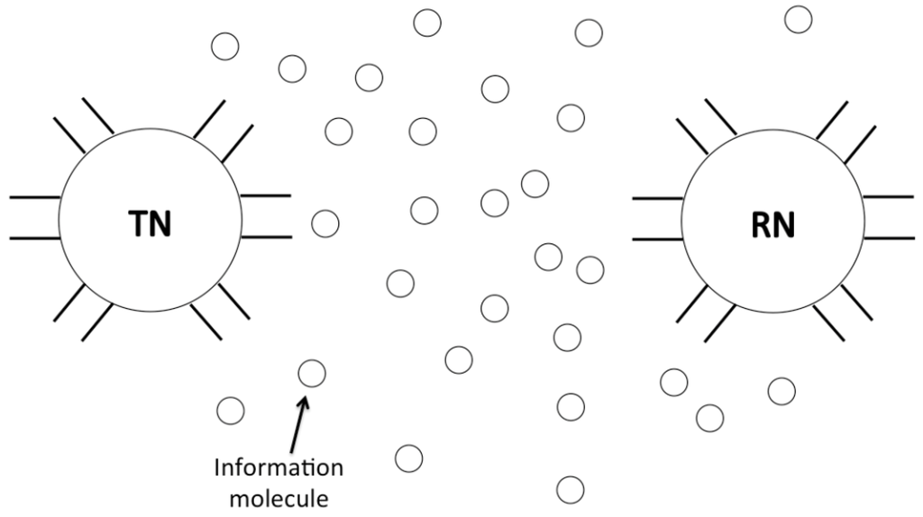 Molecular communication, a kind of bio-inspired communication, is a very popular and promising information exchange technique in the recent nano-communication and bionanosensor network studies [5,6,7,8]. A typical molecular communication system is shown in Figure 1. A transmitter nanomachine sends messages by releasing the information molecules. The information molecules propagate directionally or diffuse randomly in the environment, and reach a receiver nanomachine. The receiver nanomachine then decodes the information molecules into the original message. Since the molecular communication paradigm is different from the conventional radio communication at the physical layer such as channel and signal propagation, the corresponding communication techniques and networking protocols need to be reconsidered and redesigned.