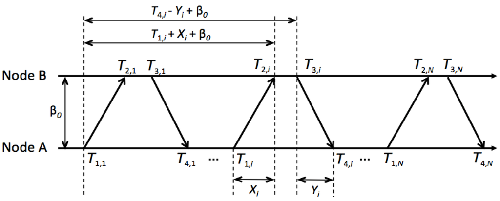 where denotes the clock offset of node B with respect to node A. and are the random variables of the propagation delays from node A to node B and from node B to node A, respectively.