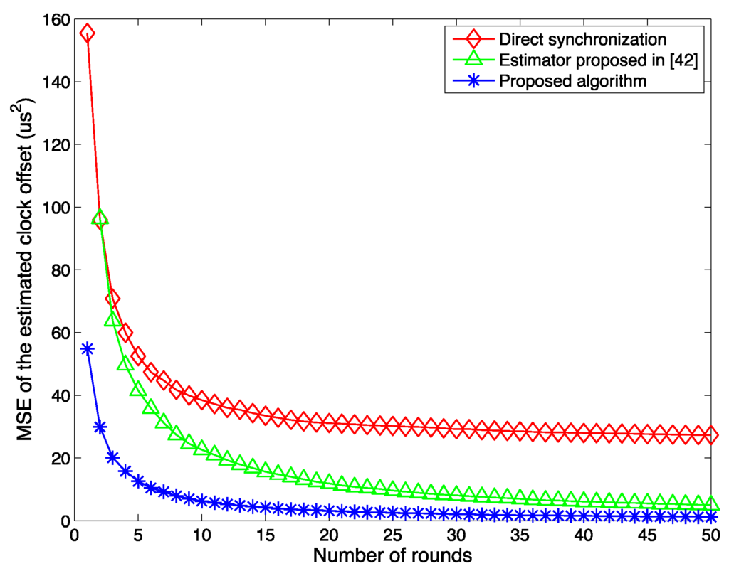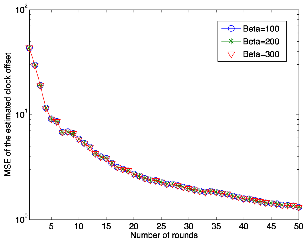 Figure 3 shows the relationship between the MSE of the estimated offset and the number of rounds for different pre-defined values. It is clear that as the number of synchronization rounds increases, the MSE of the estimated clock offset decreases quickly. This result illustrates the effectiveness of our proposed estimation algorithm. It should also be noted that after 50 rounds of the synchronization, the MSE still does not reach zero. In the figure, the MSEs of the estimated clock offset for three different initial clock offset values, 100, 200 and 300 μs, are presented. The result implies that the initial clock offset does not affect the clock synchronization accuracy by the proposed clock synchronization algorithm.