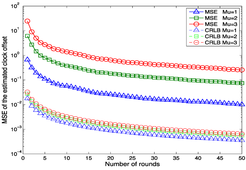 Figure 4 shows the relationship between the MSE of the estimated clock offset and the number of clock synchronization rounds with different means of the propagation delay μ. Like Figure 3, the MSE of the estimated clock offset decreases as the number of synchronization rounds increases for all the different propagation delays. This also proves the effectiveness of our proposed algorithm. It is obvious that the larger the mean propagation delay is, the larger the MSE of the estimated clock offset is. The reason for this fact is that if the mean of the propagation delay is larger, then there will be a longer period for the information molecules to move randomly in the environment. The delay will be more diverse and decrease the clock synchronization accuracy. Generally speaking, a larger mean propagation delay is due to a longer distance between the nanomachines. Therefore, a densely deployed nanonetwork could achieve a better clock synchronization performance than a loosely deployed nanonetwork in terms of accuracy.