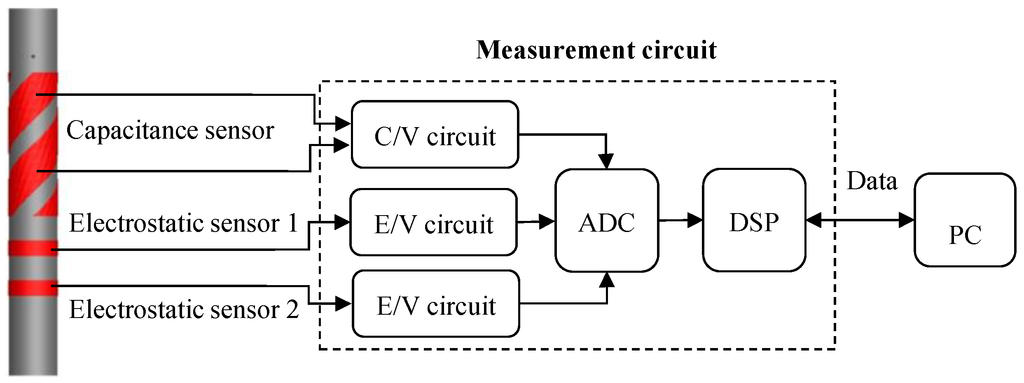Figure 1 shows a schematic diagram of the proposed integrated instrumentation system. The system is comprised of two ring-shaped electrostatic sensors for particle velocity measurement, one capacitance sensor with helical surface-plate electrodes for particle concentration measurement, one measurement circuit based on a digital signal processor (DSP) and a personal computer (PC).
