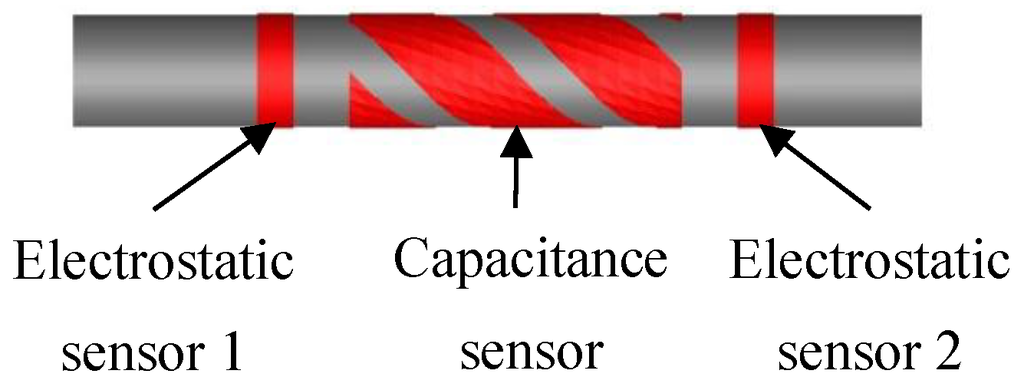 The electrodes of the electrostatic and capacitance sensors are made of copper with a thickness of 0.2 mm, and they are mounted on the outer surface of a plexiglass pipe. All the electrodes are covered in a metal shield to isolate them from any external electromagnetic interference. The inner and outer diameters of the plexiglass pipe are 50 mm and 60 mm, respectively. The axial width of the electrodes of the electrostatic sensors is 20 mm and the axial spacing between the electrodes is 40 mm. The helical surface-plate electrodes of the capacitance sensor have a axial width of 55 mm and twist one turn along the pipe surface with a pitch of π × 60 mm. In Figure 1, the two electrostatic sensors are arranged on the same side of the capacitance sensor. If the integrated system is applied to the particle measurement in a vertical pipe, the correlation velocity from the electrostatic sensors obviously deviates from the mean velocity of particles within the capacitance sensor due to acceleration effect. This will lead to a measurement error in the solid mass flow rate. Another option is to configure the two electrostatic sensors on each side of the capacitance sensor, as shown in Figure 2. In this case, the correlation velocity accurately represents the mean velocity of the solid particles within the sensing space of the capacitance sensor. However, the axial spacing of the two electrostatic sensors then increases to 250 mm, much longer than that in Figure 1. A large axial spacing may decrease the reliability of the velocity measurement, especially under the unstable flow conditions seen at low velocity. Therefore the practical flow conditions should be considered for the configuration of the sensors in the integrated instrumentation system.