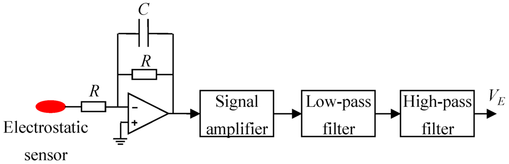 The DSP-based measurement circuit mainly consists of two electrostatic charge to voltage conversion (E/V) circuits, one capacitance to voltage conversion (C/V) circuit, one multi-channel analog to digital converter (ADC), and a DSP. The E/V circuits (Figure 3) are connected to the electrostatic sensors for the electrostatic signal conditioning, while the electrostatic-immune C/V circuit (Figure 4) based on an AC-based method is used for the capacitance measurement [28,29]. The electrostatic and capacitance signals are sampled by the DSP via the ADC. Particle velocity, concentration and mass flow rate are calculated in the DSP, and then sent to PC by a serial port for storage and display. In the C/V circuit, a band-pass filter is used to eliminate the influence of particle charging on the capacitance measurement, and a differential amplifier is to balance the standing capacitance of the capacitance measurement system, only leaving the capacitance change to be further amplified and processed.