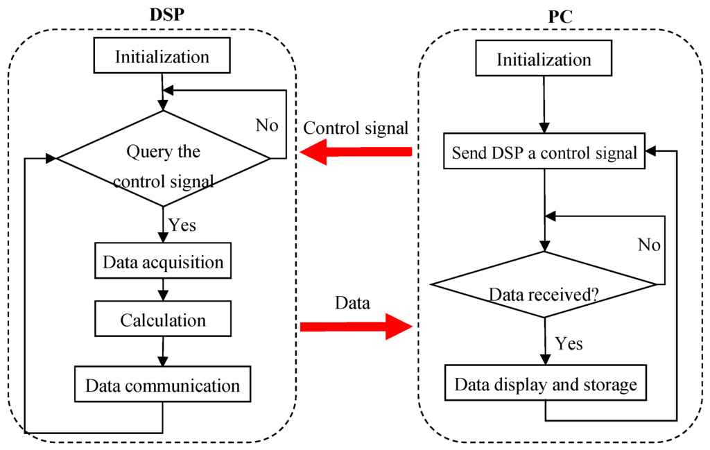The flow chartof the software of the measurement system is shown in Figure 5. After the initialization of the DSP and PC, the PC sends a control signal to DSP. If the signal is accepted, the DSP will sample the electrostatic and capacitance signals at the preset sampling frequency and integration time, and then the flow parameters including particle velocity, concentration and mass flow rate are calculated. Subsequently, the DSP sends the flow parameters to the PC and waits for the next control signal. Once the PC receives the parameters, it will send the next control signal to the DSP immediately after completing the display and storage of the parameters. The number of data sampling points in the experiments is 2000, and the corresponding response time of the measurement system is about 1.5 s.