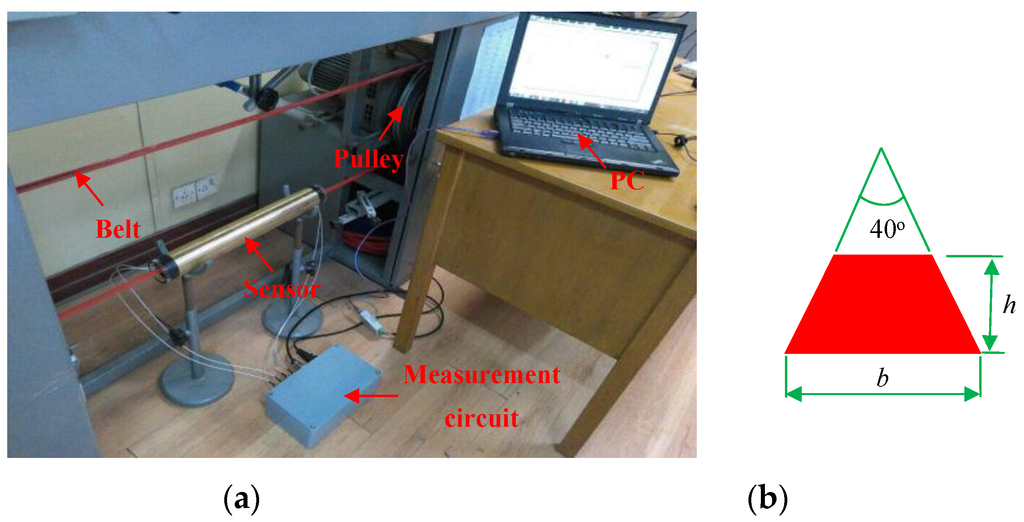 V-belt pulley rig: (a) Photograph; (b) Cross-section of the belt.