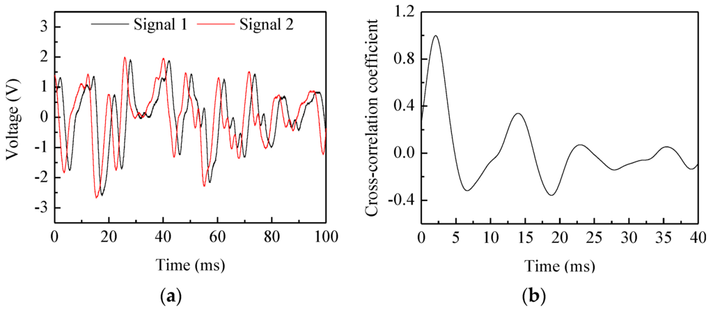 Typical electrostatic signals and their correlation function: (a) Electrostatic signals; (b) Correlation function.