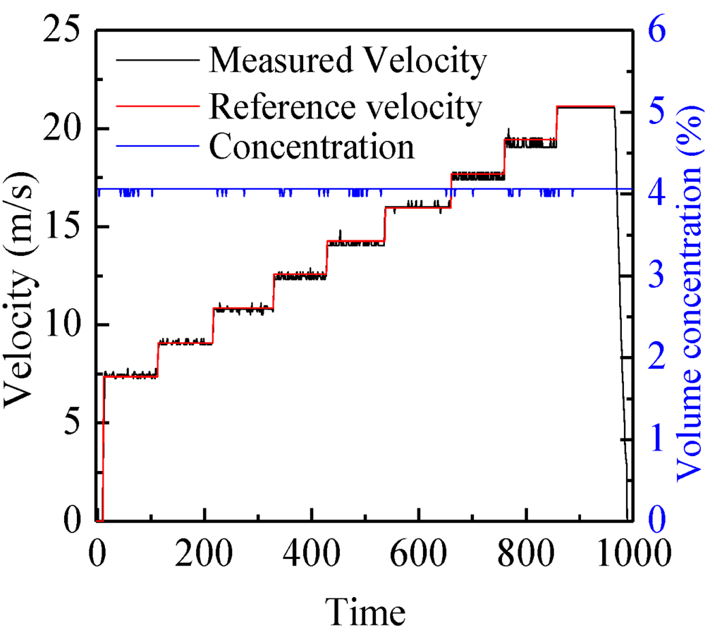 Figure 7 shows the typical electrostatic signals and their correlation function for belt #2 in the center of the pipe when the rotation speed of the pulley is 1164 r/min and its diameter is 320 mm. It can be seen that the two signals have a high similarity except for a time delay. An obvious peak can be observed in the correlation function and its time coordinate (2.08 ms) corresponds to the transit time, so the correlation velocity is 19.23 m/s, which is consistent with the reference velocity of 19.5 m/s. Figure 8 demonstrates the continuous measurement results of velocity and concentration for belt #2 in the center of the pipe at different rotation speeds of the pulley. The increasing rotation speed leads to a larger reference velocity, and thus larger measured velocity. The measured velocity and reference velocity are highly in agreement, even though there is a very small fluctuation due to the shaking and stretching of the belt. It also can be seen that the measured concentration is almost fixed as the ratio of the sectional area of the belt to that of the pipe is a constant for different belt velocities. Similar measurement results for the three types of belt at different rotation speeds of pulley are also obtained, which indicates that the C/V circuit has a good stability for particle concentration measurement regardless of particle velocities.