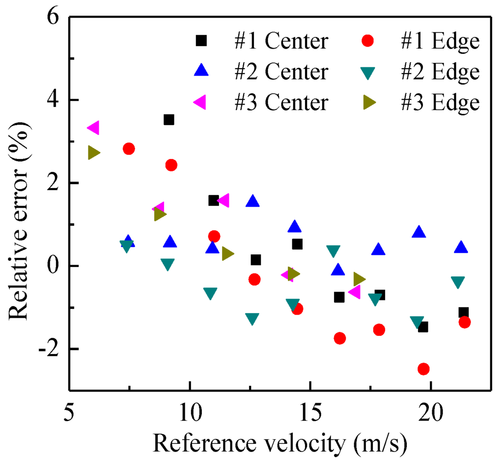 Figure 9 shows the comparisons of the measured velocities and reference velocities for the three types of belt at different rotation speeds of the pulley. It is obvious that the measured velocities are very close to the reference velocities, no matter whether the belt is in the center of the pipe or near the pipe wall (edge location). The relative error is within the range of −2%–4%, as shown in Figure 10. It verifies that the developed system can be used for accurate particle velocity measurement. Figure 11 demonstrates the measured volume concentrations for the three types of the belt. It can be seen that the measured concentrations for the location of “center” are always larger than those for the location of “edge”, and the maximum relative error of the measured concentrations to the true value is about 32.1%. This is because the geometric size of the capacitance sensor is optimized based on glass, which will be introduced in Section 4.2, and the polyurethane has a different relative permittivity fromglass, so the calibrated results based on glass cannot be used directly for other materials. The results also indicate that the optimal geometric size of capacitance sensor changes and recalibration of the concentration measurement system must be conducted for different materials.
