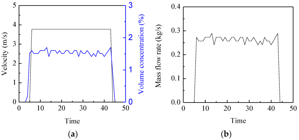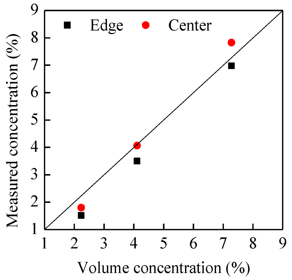 Figure 17 shows the comparison of the average measured mass flow rate with the estimated value. It is can be seen that they have a good consistence. The relative error is −3%–8%, much better than that in Figure 16. As the particle concentration is withinabout 1%–8% in experiments, the measurement results are acceptable due to the relatively higher measurement error for low concentration as calibrated in Figure 13. It is expected that more accurate results can be obtained for higher concentrations of solids particles.