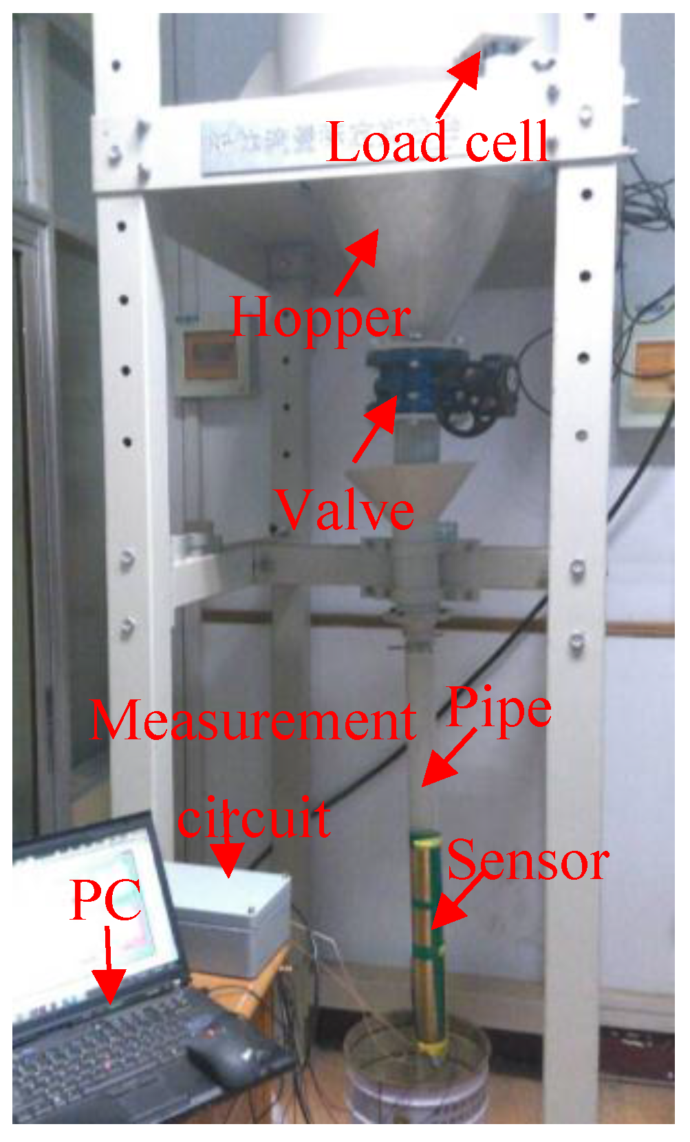 Experiments are also carried out on a gravity-fed rig (Figure 14) to evaluate the effectiveness of the developed instrumentation system. The particles are glass beads with an average diameter of 3 mm, and thus Equation (7) can be directly used for the concentration measurement.
