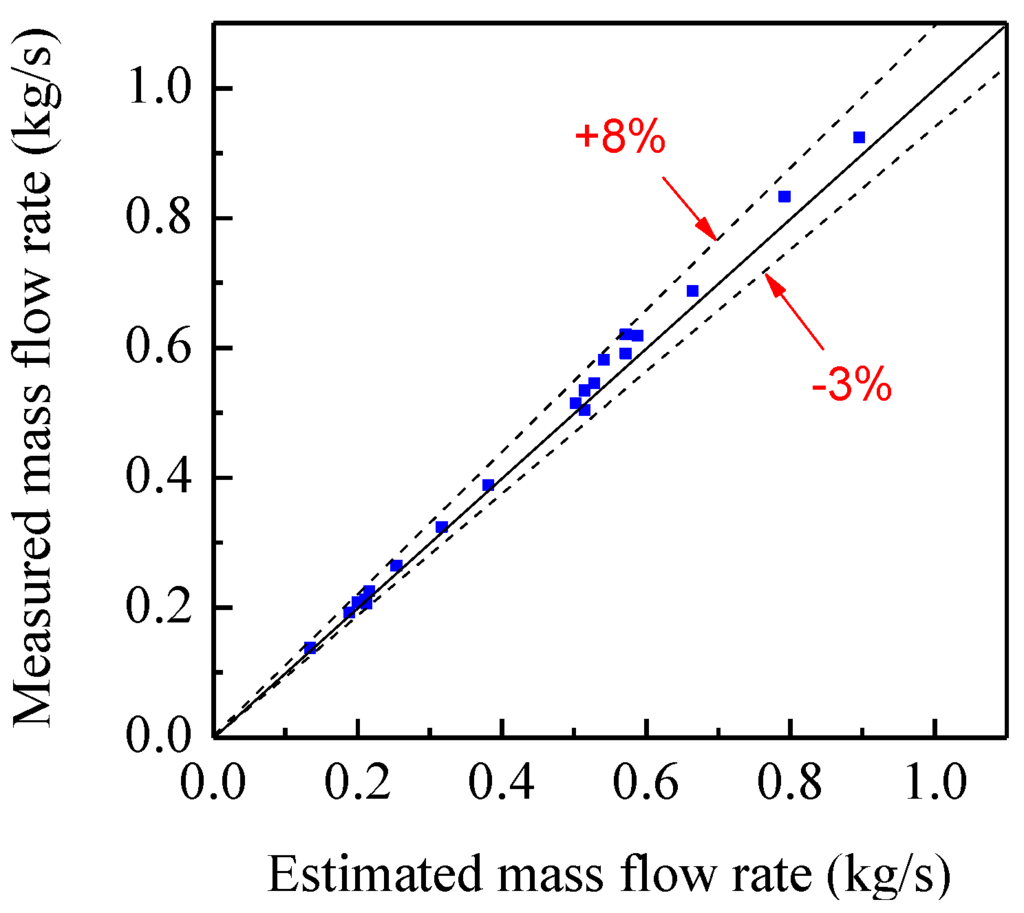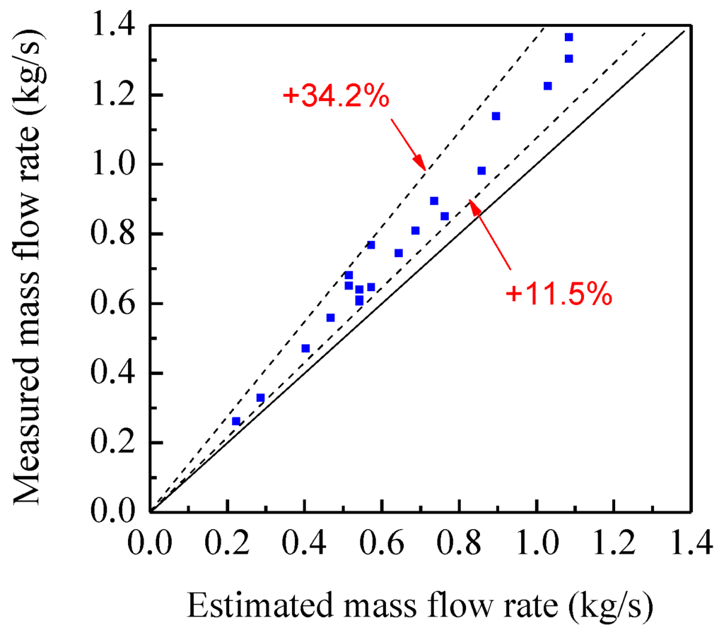 Comparison of the measured mass flow ratewith the estimated value for the sensor configuration in Figure 2.