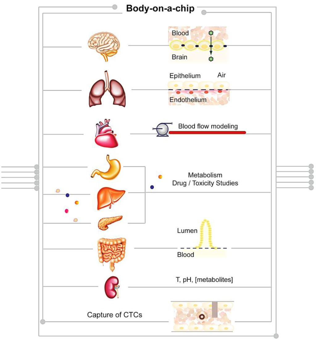 Recent advances in biomedical technologies are mostly related to the convergence of biology with microengineering. For instance, microfluidic devices are now commonly found in most research centers, clinics and hospitals, contributing to more accurate studies and therapies as powerful tools for drug delivery, monitoring of specific analytes, and medical diagnostics. Most remarkably, integration of cellularized constructs within microengineered platforms has enabled the recapitulation of the physiological and pathological conditions of complex tissues and organs. The so-called “organ-on-a-chip” technology, which represents a new avenue in the field of advanced in vitro models, with the potential to revolutionize current approaches to drug screening and toxicology studies. This review aims to highlight recent advances of microfluidic-based devices towards a body-on-a-chip concept, exploring their technology and broad applications in the biomedical field.
