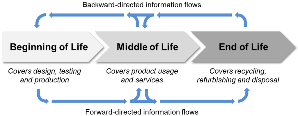 PLM is the process of handling product data, information and knowledge across a product’s lifecycle []. The terms “data” and “information” are used synonymously in the following for simplicity’s sake. The product lifecycle is a concept lent from biology where it describes the recurring change of states for certain organisms (see [] for biological lifecycle). In engineering, the organisms are exchanged for tangible goods (products) and the state changes are substituted by processes, such as design, production, use, repair, recycling and disposal. Since lifecycle processes differ among the targeted products, they are generalized into three phases stated as “beginning of life” (BOL), “middle of life” (MOL) and “end of life” (EOL) as illustrated in Figure 3. The BOL covers the design and the realization of the product, the MOL concerns the product’s usage and related value-adding services, while the EOL typically consists of several optional activities, such as reuse by other customers (second hand), remanufacturing (refurbish used product), material recycling and disposal. Along the product lifecycle, matter, energy and information is exchanged and transformed. Multiple internal and external stakeholders are involved along the lifecycle of a product.