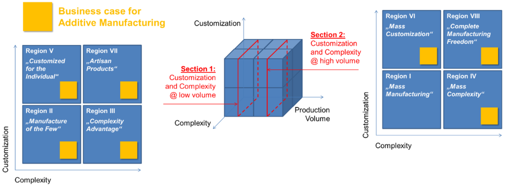 In a landmark paper on AM economics, Conner et al. discuss the business case for AM techniques in different scenarios characterized by production volume, product complexity and degree of customization. The eight basic “regions” this model foresees are depicted in Figure 5 [].