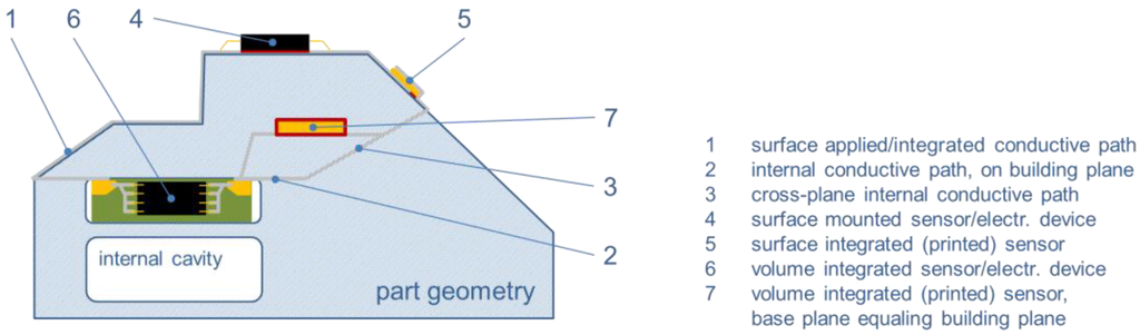 The challenge is much harder to tackle if a spatially defined change in composition or properties is envisaged, as this implies the need for locally controlled variation of materials and/or material properties. Guo and Leu thus distinguish between the aforementioned uniform composites on the one hand and functionally graded materials (FGM) on the other []: Compared to a layer-to-layer gradient along the building direction as most fundamental realization of an FGM through AM a new level of complexity is reached if variation needs to be clearly defined in three dimensions. This is the case when sensors, electric and electronic interconnects and finally electronic components themselves are to be generated during the building process, using the same manufacturing system. The promise of such components, and the potential of AM to deliver them, has long since been recognized []: It is a fundamental aspect of our current scenario.