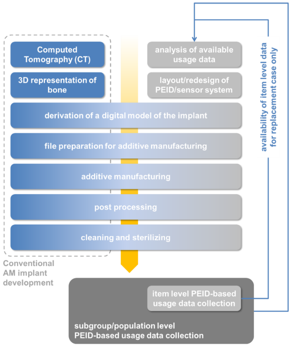 With this overall vision in mind, the different areas and their current state of the art are illustrated in the second chapter. In its first Section 2.1, product life cycle management (PLM) and item-level information flows, as well as Intelligent Products as one way of capturing information, are introduced. Following this, in Section 2.2 the focus is put specifically on product usage information, based on its key role in our concept, before the topic of sensor-integration in additive manufacturing is touched upon in Section 2.3. Within it, additive manufacturing is described in greater detail, looking into the current ability to create complex and multi-material structures. Section 2.4 explores how automated design, based on PLM data, may be capable of creating customized products in an efficient and timely way. The synthesis of all elements contributing to our concept is explained in more detail, though still on a level of principles, in Section 3. It is further illustrated via three comprehensive case studies, which together form Section 4. The first of these is focused on medical implants. In this application, the generation-to-generation adaptation based on strictly individual use patterns is a challenge that links up to our vision especially in terms of the need for customization. Besides, the application as such is already associated to AM, which is an established manufacturing process in this field, and to sensor integration, though in the latter case mainly on an academic level. The second case addresses robots as products that are integrated in a closed-loop adaptive design and manufacturing process. They contribute their inherent connectivity and sensor integration to support the cloud-based manufacturing vision. The third case represents a near-complete implementation study of our vision, using the shoe industry as example. Except for an extensive automation of the usage data-driven design processes, all elements of the present study’s underlying notions are reflected in this example.All case studies are critically discussed in Section 5, alternately assuming the positions of the various stakeholders involved. Section 6 concludes our paper and provides an outlook on further paths of research in the area.