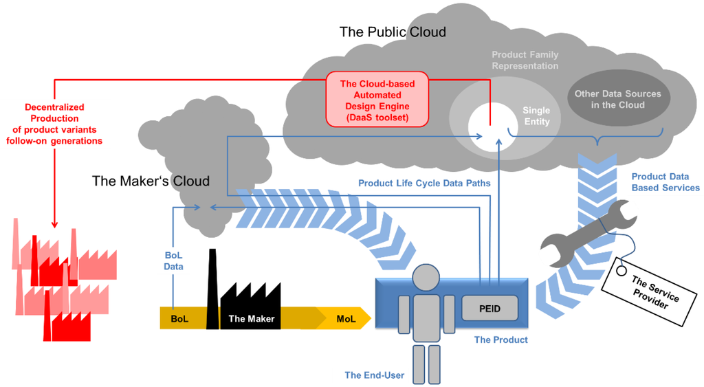 A global manufacturing environment like this could transform the way we make things. The paradigm shifts implied are manifold: For one thing, as product development would not require parallel development of production equipment, design and production could move further apart. At the same time, and as described above, flexibility in manufacturing could be used to optimize products on a customer or customer group basis, and furthermore, to implement a continuous design optimization. Practically this means nothing less than brushing aside the fundamental concept of individual product generations. Since optimization needs a basis, a primary prerequisite is a usage data link allowing backflow of information from product to designer. Equally important is a legally and technically secure access for the various potential producers and service providers to initial and optimized product design and manufacturing information. This global access to (general product and usage) data, software tools and finally manufacturing resources is the primary link of our scenario to the concept of the cloud (please consider also Figure 8 in Section 3 in this respect). Cloud-based manufacturing (CBM), sometimes also designated Cloud Manufacturing (CMfg), in general is currently the object of intense study [,,,] Xu et al., to give an example, introduced cloud manufacturing via the earlier-adopted concept of cloud computing, defined by the National Institute of Standards and Technology (NIST) as “a model for enabling ubiquitous, convenient, on-demand network access to a shared pool of configurable computing resources (e.g., networks, servers, storage, applications, and services) that can be rapidly provisioned and released with minimal management effort or service provider interaction.’’ []. Cloud manufacturing extends Cloud Computing by including production processes (scheduling, resource planning etc.) and related Cyber-Physical Systems (CPS) as active units []. Another definition has been provided by Wu et al., who discuss whether CBM is indeed the paradigm change as which it is currently being advertised. Their answer is in the affirmative: By reviewing the suggested definitions of the field and adding their own perspective, they manage to delimit CBM both from earlier concepts like flexible and redistributable manufacturing systems and intermediate development stages like web- and agent-based manufacturing (WBM, ABM) []. A true CBM approach, in their eyes, needs to integrate “Infrastructure-as-a-Service (IaaS), Platform-as-a-Service (PaaS), Hardware-as-a-Service (HaaS), and Software-as-a-Service (SaaS)” elements and is distinguished from WBM and ABM by its capability of facilitating new business models through such elements [,]. In further publications, Wu et al. have linked their studies to additive manufacturing and looked at product design, too, thus extending the original term CBM to cloud-based design and manufacturing (CBDM) [,]. Interestingly, however, the usage data feedback is not considered a core feature of CBM in these definitions: Data from the usage or Middle-of-Life (MoL) phase is included in some of the projections offered, though not in an automated fashion, but solely by way of direct end user (customer) feedback and integration in the design process (customer co-design). The practical implementation of such end user-centered feedback facilities is seen as major research issue. Besides, as we will show later in case study 2 (Section 4.2), the notion of separated ABM and CBM approaches brought forward by Wu et al. can be overcome [,].