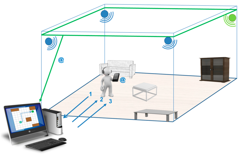 Figure 1 also shows the physical components of the system. In addition to the aforementioned smartphone, UWB sensors, and the UWB tag embedded in the headphones, there is also a server which hosts several modules, as shown in Figure 2, that are in charge of the different tasks of the system. Most of the processing relies on this server, whereas the smartphone carried by the user has little computational load and is mostly used for user interaction tasks through the headphones. Communication between the different components, in turn, is conducted by using a wired Ethernet network (in the case of the UWB sensors) and a Wi-Fi network (for the communication between the server and the smartphone).