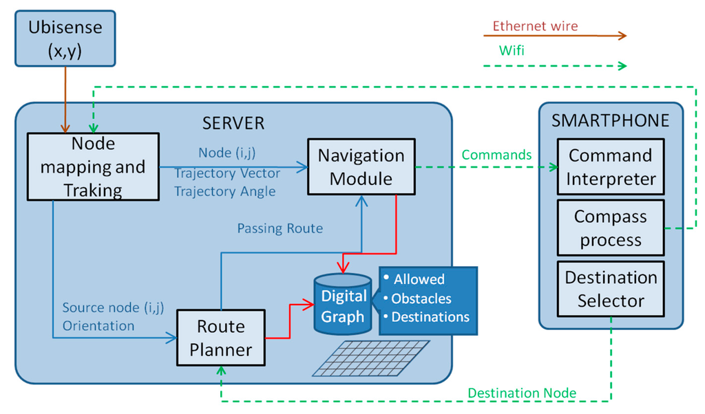 Among the many different technologies and techniques which may be used for positioning, Ultra-Wideband (UWB) stands out for the high accuracy it can achieve in indoor environments []. UWB uses narrower radiofrequency pulses than other RF technologies, which facilitates distinguishing direct path signal carrying useful information for positioning from reflections. In addition, the presence of obstacles may have a major impact on the Received Signal Strength Indicator (RSSI); however, UWB in combination with methods estimating position according to the time or angle of arrival will not be so affected. Therefore, UWB-based positioning technologies can be quite robust and, having a transmission range greater than other competing technologies such as RFID, enable less complex deployments with fewer devices. In this study, the Ubisense [] UWB-based commercial solution has been used to obtain periodic location updates, which, combined with other orientation information acquired by a smartphone, are processed in order to improve accuracy, and to serve as input for other system modules in charge of planning routes and guiding the user.