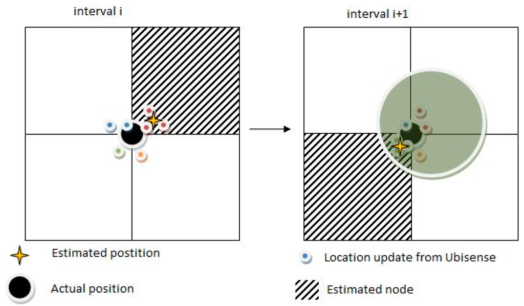 As for the selection of the current node, the node mapping module must accurately determine in which node of the detail graph the user is located. For this purpose, the module establishes a periodic interval during which it collects location updates from Ubisense and, after every interval, the node estimation takes place. The duration of this interval is parameterized and has been chosen to be approximately similar to an average stride time so that from one estimation to the next there is enough time for a person to move to another node. The calculation of the node where the user is located is conducted by checking the coherence of the movement with regard to the time window where samples are taken and calculating an average. The node is estimated with high precision, although in some cases where the user is located close to the boundary between two or more nodes it is possible that the node is assigned to any of the adjacent nodes. In any case, this is acceptable, since in this particular case the distance from the actual position to any of the nodes is quite short, and does not jeopardize the overall performance of the system. However, determining if a person is moving or not can be challenging because of this. If the user is standing close to a node boundary, it is possible that every time that a new mapping estimation is done the user is assigned to a different node and thus a false motion estimation is inferred. Similarly, if a user placed at one of the sides of the node moves to another of the sides, it is likely that the estimated node remains the same, which is right, but no movement is reported. In order to solve these problems several movement estimation methods were studied. Finally, it was decided to ignore the node mappings and instead use the average position estimated during consecutive intervals. As can be seen in Figure 3, a circle of a certain radius, centered on the previous location estimated, is drawn; if the new estimation is contained within this circle the user will be considered to have stopped, and otherwise to be moving. In this figure, during interval i the user is standing on the boundary between four nodes. From a location point of view, it is not very important to which of the adjacent nodes it is assigned by the mapping module, as the user is equally distant to all of them. However, if the user is assigned to a different node after interval i + 1, the mapping module will not report that the user is moving since it can observe that the estimated locations at intervals i and i+1 are quite close within the maximum distance represented by the circle in the right part of the figure.
