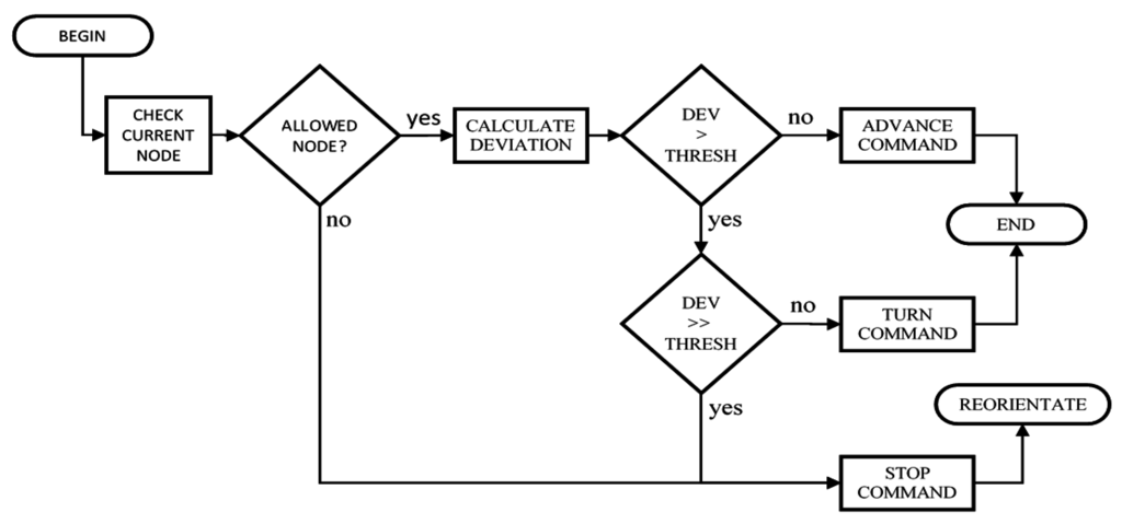The operation of the module to get the user to the next reference point is depicted in the flowchart of Figure 5. Firstly, the module checks the user’s position and, should they be in a not allowed node (obstacle node), a stop command will be issued and afterwards the user will be reoriented toward the next reference point. This reorientation implies that the route planner recalculates the route to the destination, since there are no guarantees that the path to the next reference point is free of obstacles. In the case the user is in an allowed node, then their trajectory (trajectory vector) is compared with the objective trajectory to the next reference node. If the deviation is smaller than a certain threshold, an advance command will be issued. On the contrary, if the deviation is bigger than the threshold, an order asking them to turn is sent. There is also the possibility that the deviation from the path is too large. In this case, the procedure would be similar to that explained above for nodes not allowed: the user would be asked to stop and they would be reoriented.