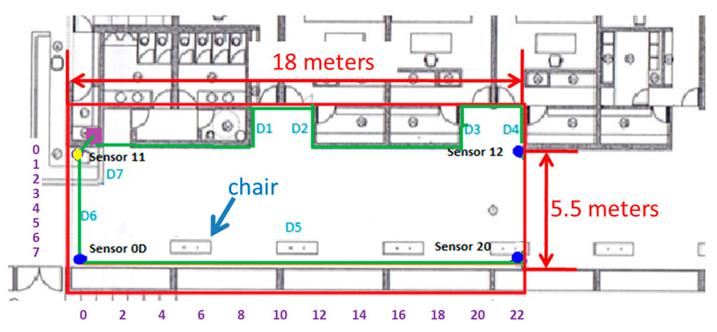 As was established in Section 3, the system uses a spatial database characterizing the environment where the covered area is mapped into square nodes. Therefore, once the sensors are installed, the next step is to measure two reference points that will be matched with the corresponding points in the digital map in order to calibrate the scale. As a rule of thumb, and in order to simplify the testing procedure, the tiles of the floor (with a shape of 40.5 × 40.5 cm) were used as a pattern for the node’s size. That is, a node was considered as a square composed of four tiles, with a size of 80.1 × 80.1 cm. This consideration leads to a mapped area of 22 columns and seven rows (represented in the system as a 22 × 7 matrix and represented in Figure 6 with numbers in purple) corresponding to a covered area of approximately 18 × 5.5 m (also depicted in the figure).