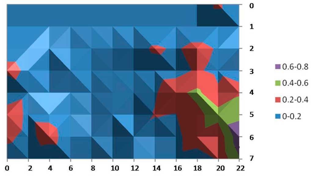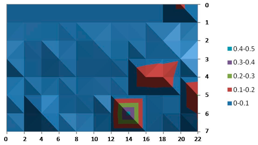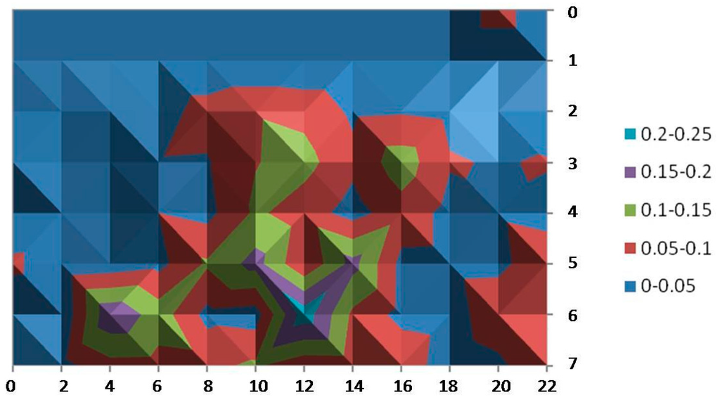In the same way, Figure 8 shows the average error of the y coordinate over the considered area. It is observed that, in this scenario, Ubisense seems to be more stable for the x-coordinate: In almost the entire area, the average error has values below 20 cm and just a small portion of the area is in the highest range of 60–80 cm. On the other hand, the average error calculated for the y-coordinate shows higher values (ranging up to 60 cm and even an isolated small area with values of 80 cm can be noticed). In addition, these higher values are not enclosed in a small area and can even be found in the central (and probably more walkable) area.