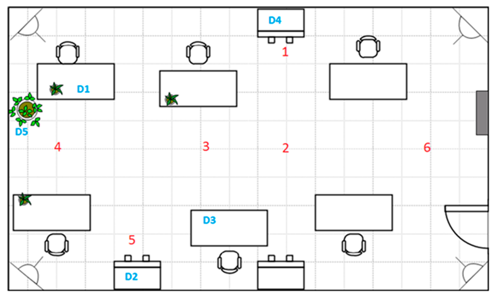 Another test was performed in the facilities of LQT comparing the accuracy performance using one and two tags. Six different points of an office, shown in Figure 11, were selected to evaluate the location error for both cases, considering different situations such as points close to metal objects (points 1 and 5), where the worst performance is expected, points in the middle of the room (points 2 and 3), and points at the ends of the room (points 4 and 6). Four samples were taken for each selected point (similar to the number of samples processed by the node mapping module during an estimation interval) and the average errors were calculated, as shown in Table 1.