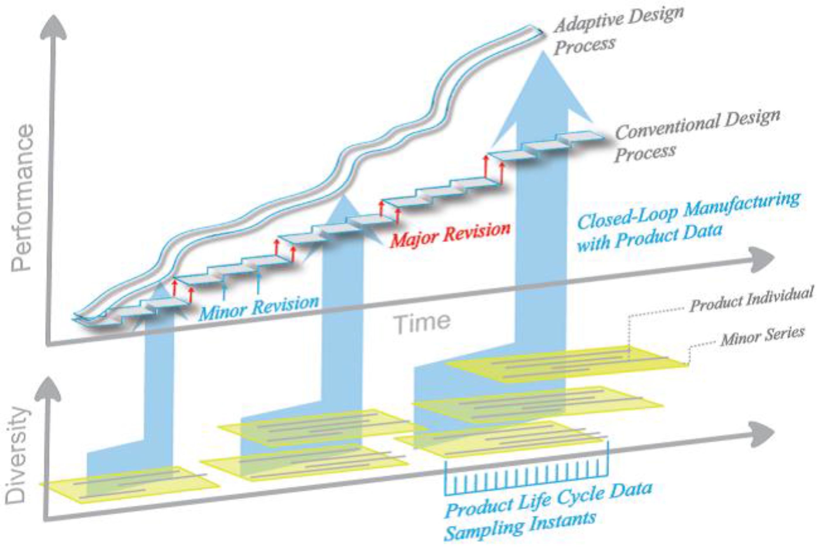Figure 1 graphically represents the impact of this concept on product generations and diversity, with continuous change replacing the major revisions (these are retained in the new approach on lower level with e.g., feature addition as discriminator, leading to product groups with close internal and more remote external relation) as well as the minor ones of a more common organization of the process. Conventional production technology, specifically in mass production, is not matched easily with this vision. Mass production typically relies on complex manufacturing equipment and thus high investment costs to reduce part costs based on an economy of scales approach: Flexibility is sacrificed for the sake of productivity. Tools are matched to products, causing adaptation of the latter to be costly. What, then, if production processes provided boundless flexibility, and changes to the product could be realized virtually, as changes to its digital representation, and at virtually no cost?