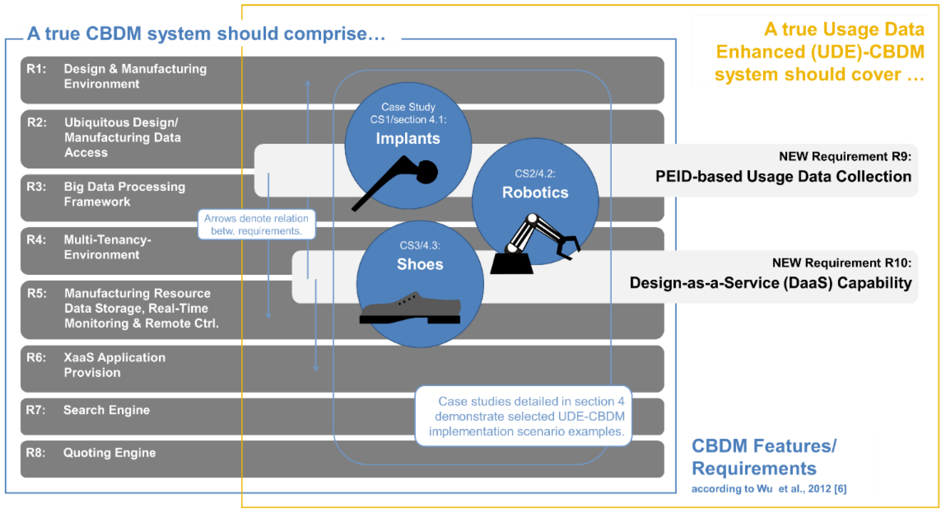 That said, we may match our own perspective of what might be called “Usage Data-Enhanced Cloud-based Design and Manufacturing” or UDE-CBDM to the requirements proposed in the literature to distinguish cloud-based from conventional manufacturing. We have done so in Figure 2, contrasting the set of eight requirements a CBDM approach has to meet according to Wu et al. [8] with two additional requirements that together with the initial ones constitute the UDE-CBDM case.