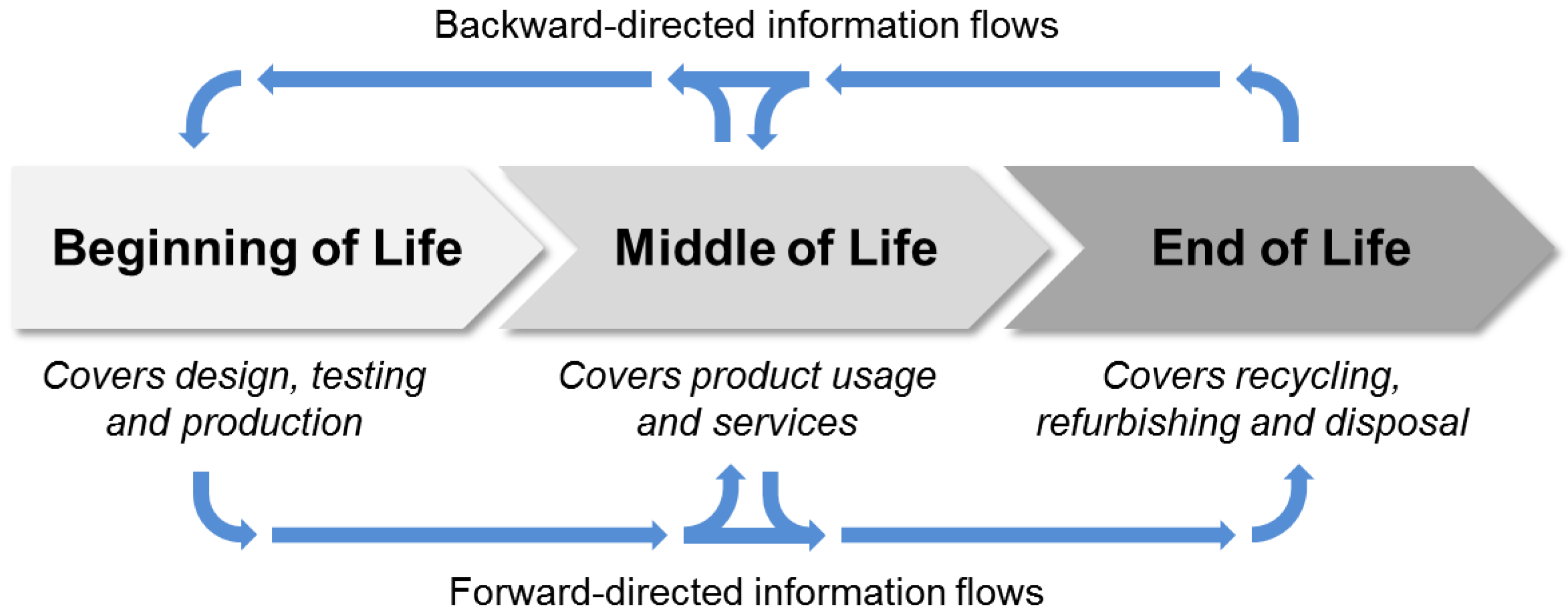 PLM is the process of handling product data, information and knowledge across a product’s lifecycle [16]. The terms “data” and “information” are used synonymously in the following for simplicity’s sake. The product lifecycle is a concept lent from biology where it describes the recurring change of states for certain organisms (see [17] for biological lifecycle). In engineering, the organisms are exchanged for tangible goods (products) and the state changes are substituted by processes, such as design, production, use, repair, recycling and disposal. Since lifecycle processes differ among the targeted products, they are generalized into three phases stated as “beginning of life” (BOL), “middle of life” (MOL) and “end of life” (EOL) as illustrated in Figure 3. The BOL covers the design and the realization of the product, the MOL concerns the product’s usage and related value-adding services, while the EOL typically consists of several optional activities, such as reuse by other customers (second hand), remanufacturing (refurbish used product), material recycling and disposal. Along the product lifecycle, matter, energy and information is exchanged and transformed. Multiple internal and external stakeholders are involved along the lifecycle of a product.