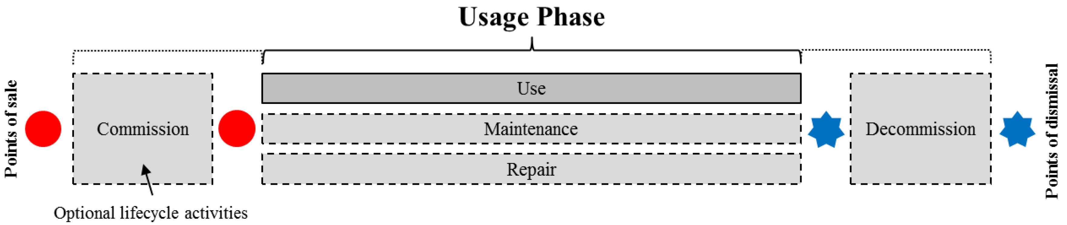 In product design, information about the usage of products helps engineers to understand, for instance, which product features are fit for purpose and which ones are not. Usage information is describing different activities of the usage phase. For durable goods with a long lifetime, the MOL phase might consist of five distinct processes as illustrated in Figure 4.