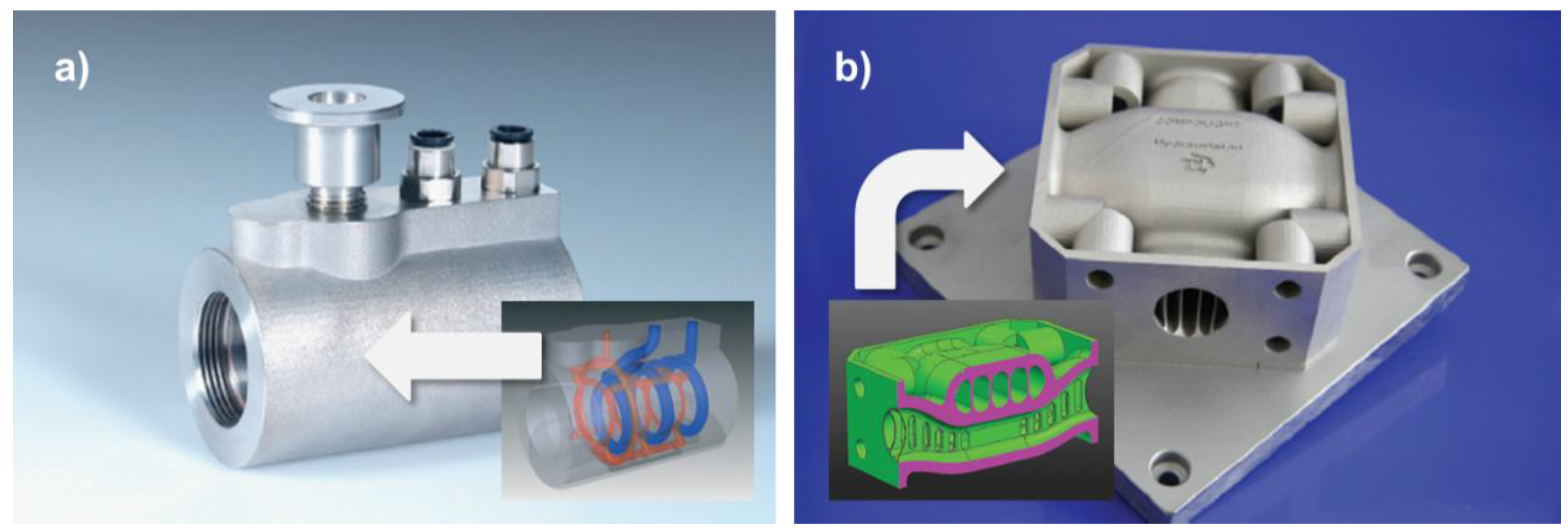 Examples of products and case studies representing major regions of interest of AM technology application: (a) A plastic injection molding die featuring conformal cooling channels [70], an example of the Rapid Tooling approach representative of region II and III according to Connor et al. [66] and as depicted in Figure 5; (b) low weight, low flow resistance hydraulic crossing [70], region III and IV.