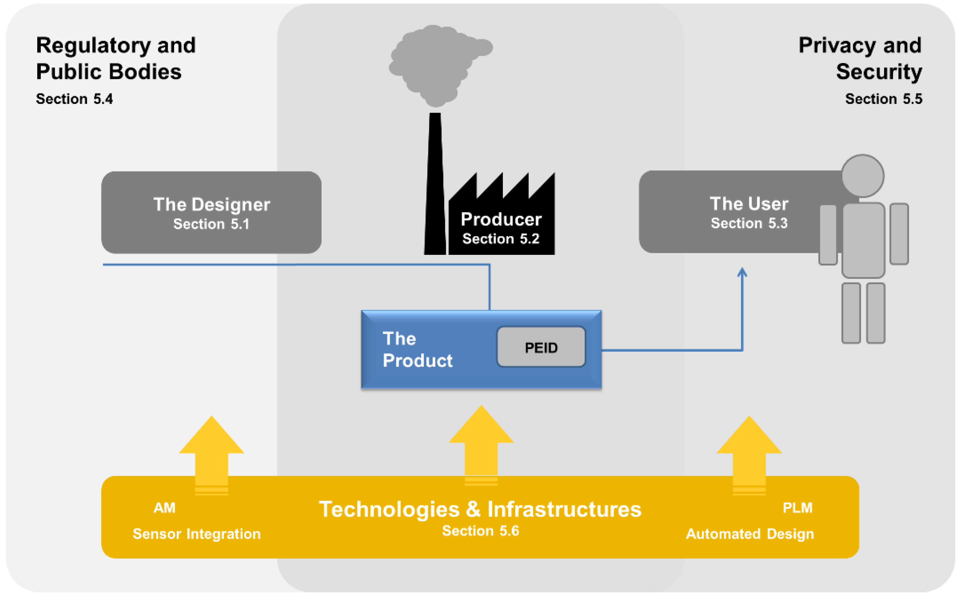 In practical implementations of this framework, given that (consumer and professional) products are often used in a rather unique way by the customers, the usage information obtained is most likely on an item-level. Today’s research in Product Lifecycle Management (PLM) is focusing on the rather complex problem of how to capture, organize and present information along the complete lifecycle. In the vision of this paper, PLM is the conceptual foundation providing the necessary information to the other processes, e.g., from usage to design and manufacturing. On a technological level, combinations of products with so-called product-embedded information devices (PEIDs) are required. PEIDs can be seen as smart sensor systems or cyber-physical systems (CPS, which brings the topic of their integration into products down to the field of sensor integration and material-integrated intelligent systems.