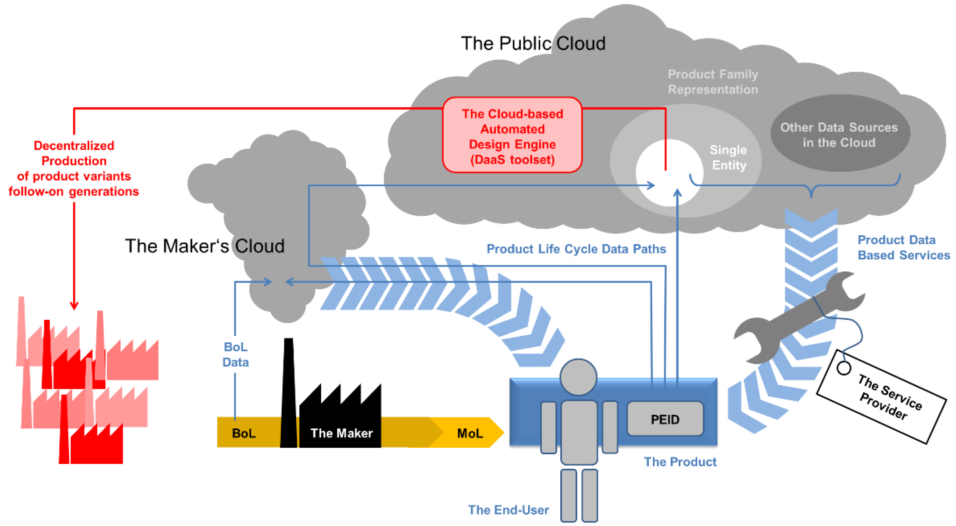 A global manufacturing environment like this could transform the way we make things. The paradigm shifts implied are manifold: For one thing, as product development would not require parallel development of production equipment, design and production could move further apart. At the same time, and as described above, flexibility in manufacturing could be used to optimize products on a customer or customer group basis, and furthermore, to implement a continuous design optimization. Practically this means nothing less than brushing aside the fundamental concept of individual product generations. Since optimization needs a basis, a primary prerequisite is a usage data link allowing backflow of information from product to designer. Equally important is a legally and technically secure access for the various potential producers and service providers to initial and optimized product design and manufacturing information. This global access to (general product and usage) data, software tools and finally manufacturing resources is the primary link of our scenario to the concept of the cloud (please consider also Figure 8 in Section 3 in this respect). Cloud-based manufacturing (CBM), sometimes also designated Cloud Manufacturing (CMfg), in general is currently the object of intense study [2,3,4,5] Xu et al., to give an example, introduced cloud manufacturing via the earlier-adopted concept of cloud computing, defined by the National Institute of Standards and Technology (NIST) as “a model for enabling ubiquitous, convenient, on-demand network access to a shared pool of configurable computing resources (e.g., networks, servers, storage, applications, and services) that can be rapidly provisioned and released with minimal management effort or service provider interaction.’’ [6]. Cloud manufacturing extends Cloud Computing by including production processes (scheduling, resource planning etc.) and related Cyber-Physical Systems (CPS) as active units [3]. Another definition has been provided by Wu et al., who discuss whether CBM is indeed the paradigm change as which it is currently being advertised. Their answer is in the affirmative: By reviewing the suggested definitions of the field and adding their own perspective, they manage to delimit CBM both from earlier concepts like flexible and redistributable manufacturing systems and intermediate development stages like web- and agent-based manufacturing (WBM, ABM) [7]. A true CBM approach, in their eyes, needs to integrate “Infrastructure-as-a-Service (IaaS), Platform-as-a-Service (PaaS), Hardware-as-a-Service (HaaS), and Software-as-a-Service (SaaS)” elements and is distinguished from WBM and ABM by its capability of facilitating new business models through such elements [7,8]. In further publications, Wu et al. have linked their studies to additive manufacturing and looked at product design, too, thus extending the original term CBM to cloud-based design and manufacturing (CBDM) [9,10]. Interestingly, however, the usage data feedback is not considered a core feature of CBM in these definitions: Data from the usage or Middle-of-Life (MoL) phase is included in some of the projections offered, though not in an automated fashion, but solely by way of direct end user (customer) feedback and integration in the design process (customer co-design). The practical implementation of such end user-centered feedback facilities is seen as major research issue. Besides, as we will show later in case study 2 (Section 4.2), the notion of separated ABM and CBM approaches brought forward by Wu et al. can be overcome [9,10].